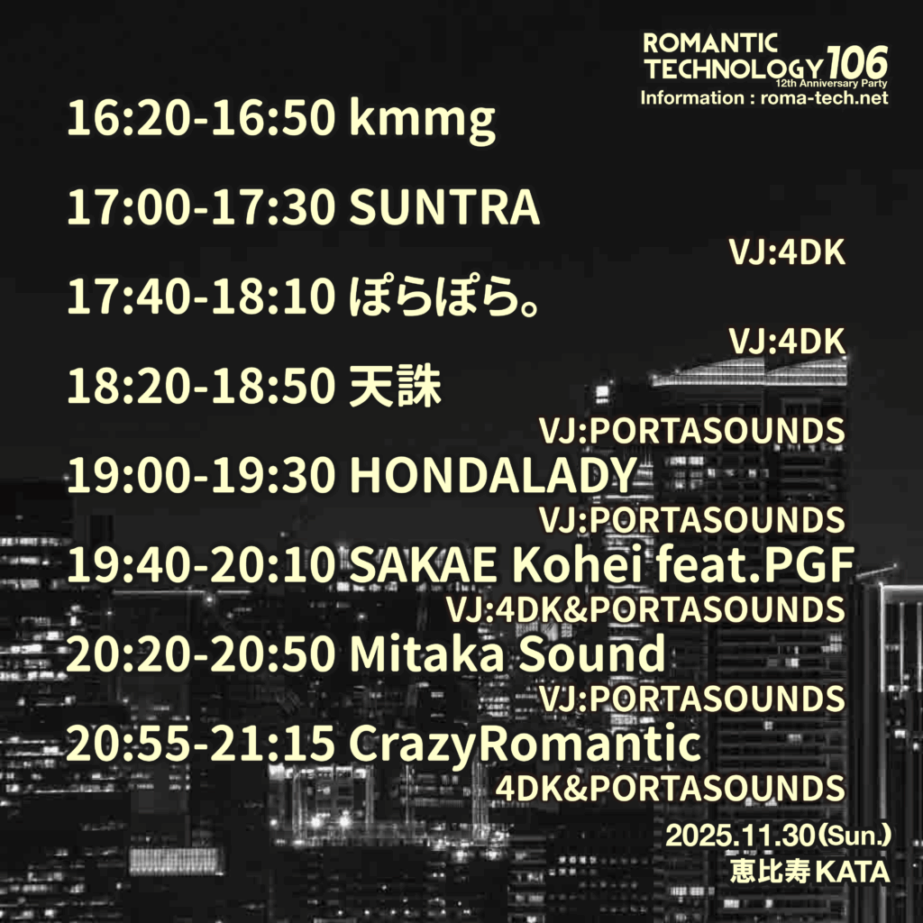 また、2023年11月よりミュージックイベントROMANTIC TECHNOLOGY 通称”ロマテク”やレーベルROMANTIC TECHNLOGY RECORDS、RT TRAXを主宰している。